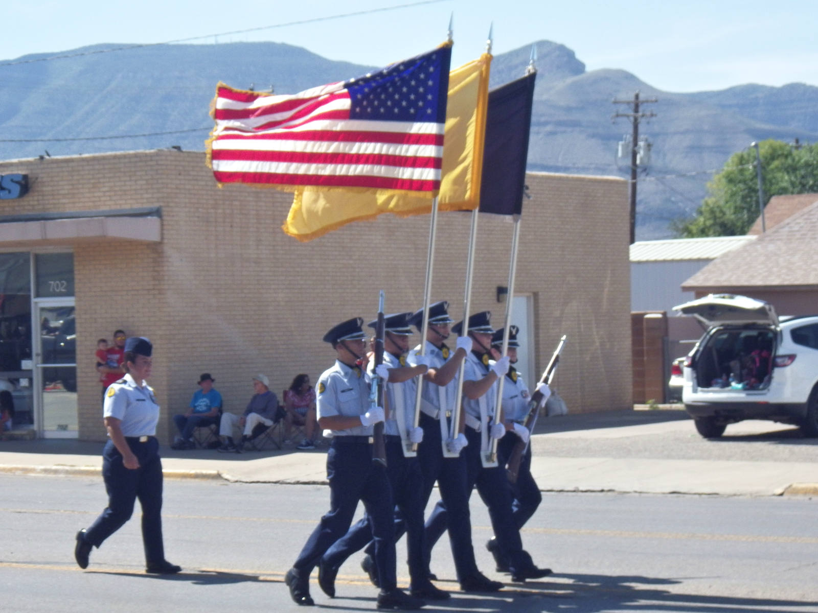 Police and fire trucks begin and end the parade. The Honor Guard is high school JROTC kids.